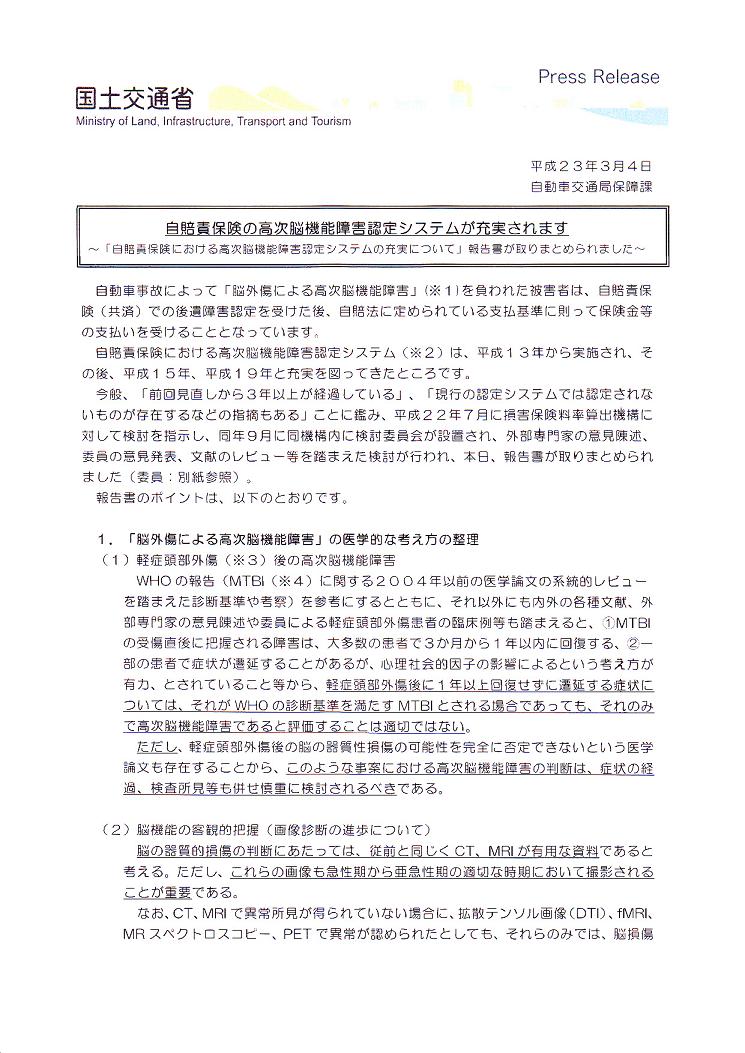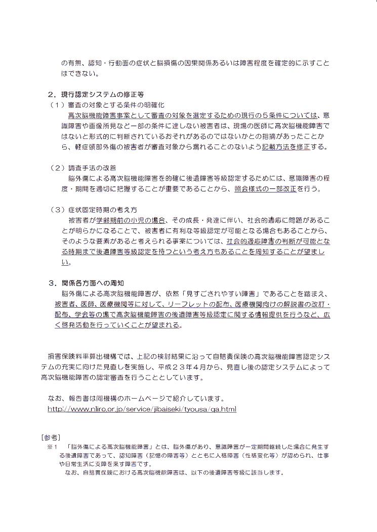 自賠責保険における高次脳機能障害認定システム検討委員会報告書は