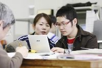 ライトノベルをテーマにした「大衆文化論B」の授業では、同4年波多野紘子さん(21)と同3年宮脇習介さん(20)が両脇に座り、ノートテイカーとしてサポートした。