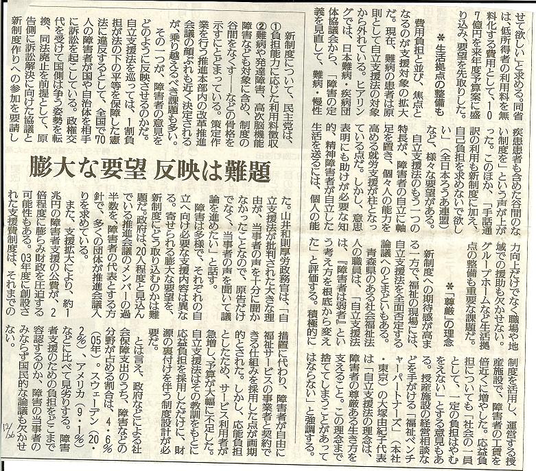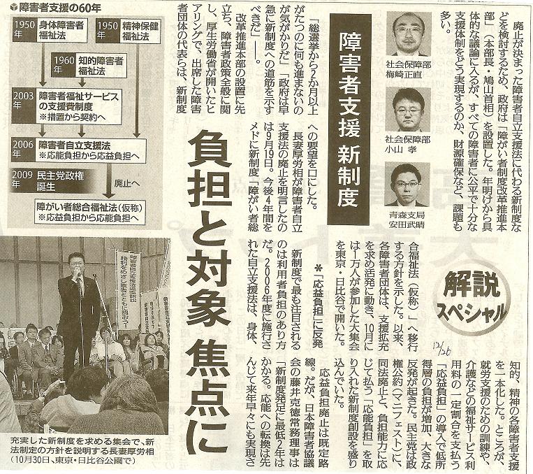 基本合意は、このほか、利用者負担や制度の谷間を作らないための障害の範囲見直しなどを、新法の論点とする▽来年度予算案にない低所得者の医療費負担を当面の重要課題とする▽基本合意の履行状況を確認するための原告団・弁護団と国(厚労省)の定期協議の実施など。