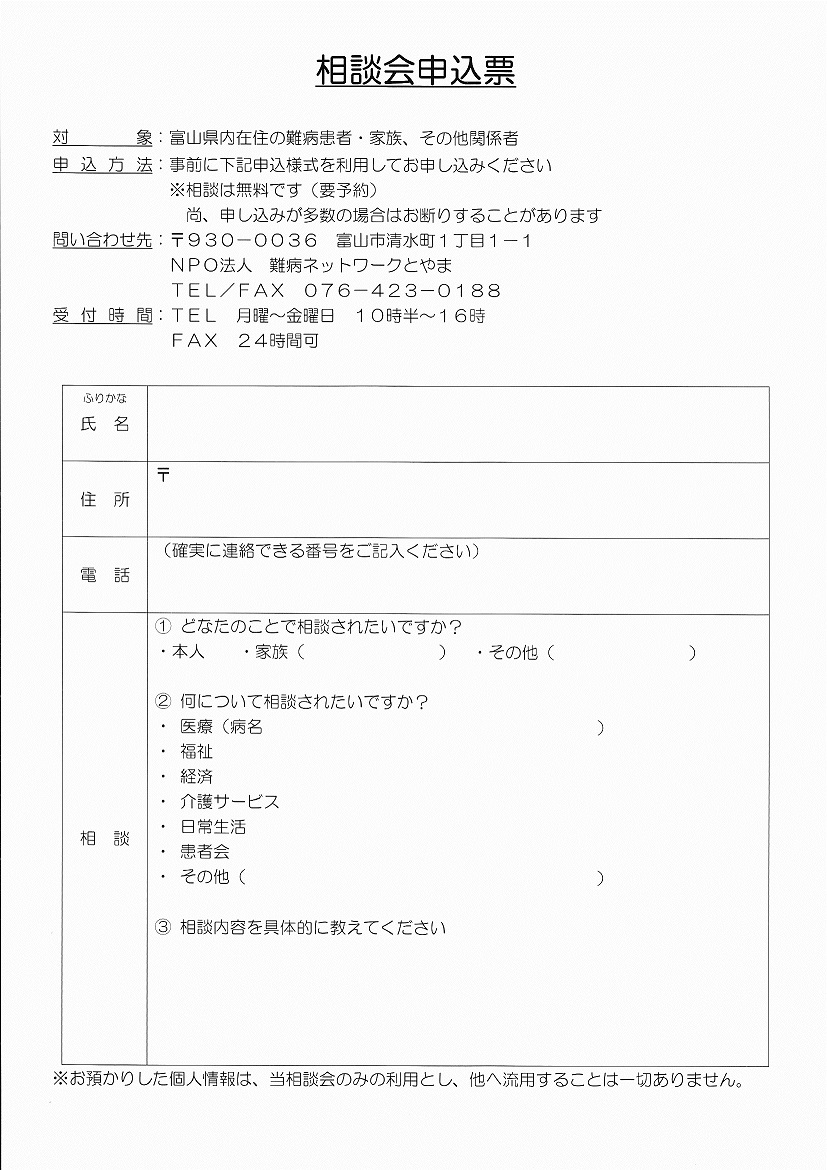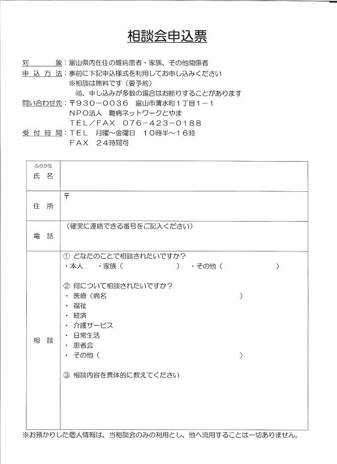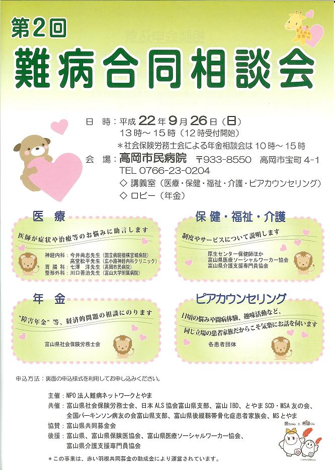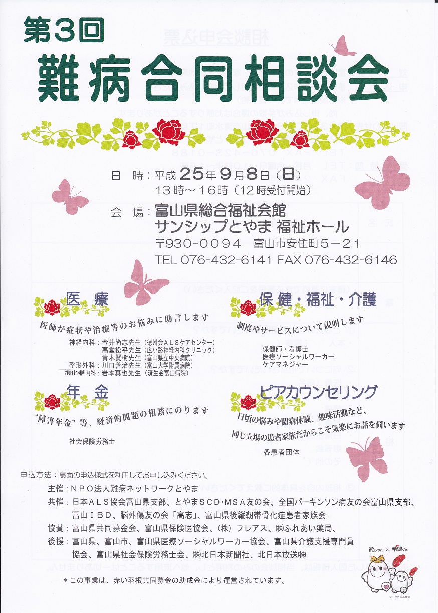 今年も第2回目の難病合同相談会が難病ネットワークとやま主催で開催されます。
