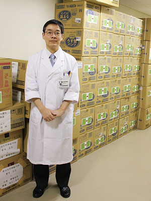 青木医師:難病ネットワークとやまが送った支援物資の前で
