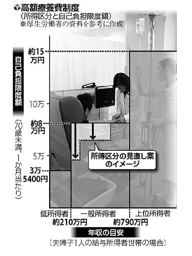 この案は、〈1〉一般所得区分をさらに細かく分け、比較的低所得者の負担が軽減されるように上限額を設定し直す〈2〉自己負担額に年間上限額を設ける――などが柱となっている。
