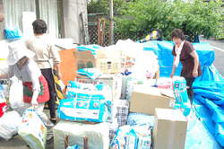 南三陸町に送るおむつの積み込み作業をする協力者ら=富山市森住町で