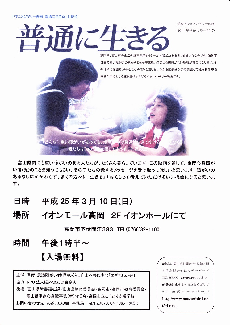 ンタリー映画「普通に生きる」上映会を開催することとなりました。私たちは、この映画を通じて、重度心身障が
